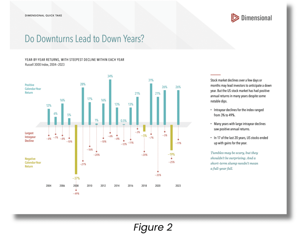 Nor do sharp downturns within one calendar year always lead to negative returns for the entire year (See Figure 2). With the notable exception of 2008 and two other years, if we look at the period 2004–2023, we see that most of the years with the largest intra-year declines wound up producing positive calendar year returns. These include 2009, which experienced a 27% decline in the wake of the financial crisis of 2008 but finished the year at a positive 27%, and 2020 during which the COVID pandemic shut the economy to the tune of a 35% decline in the market, only to rebound to post a positive 21% by year’s end. (Source: DFA – Do Downturns Lead to Down Years? – 4/2024)
