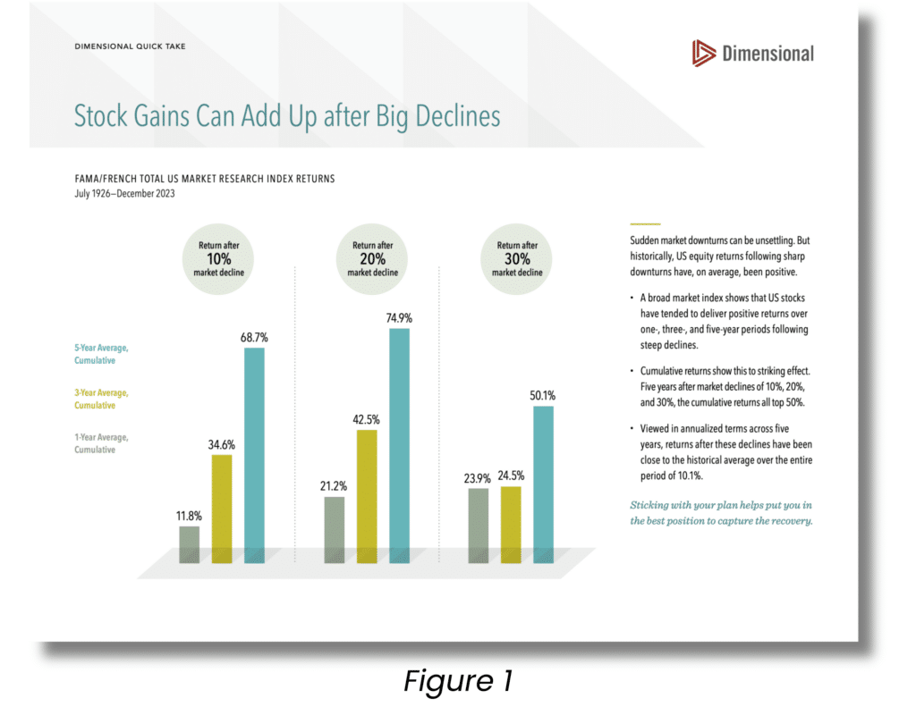 While historical performance is no guarantee of future performance, history teaches us that U.S. equity returns following downturns have, on average, been positive (See Figure 1). For example, according to data from Fama/French Total US Market Research Index and collected by Dimensional Fund Advisors (DFA), between July 1926 and December 2023, returns following 10% market declines averaged 11.8% after one year, 34.6% after three years, and 68.7% after five years. The returns following 20% market declines have been even greater. Five years after market declines of 10%, 20%, and 30%, the cumulative returns all top 50%. (Source: DFA – Stock Gains Can Add Up after Big Declines – 2/2024)
