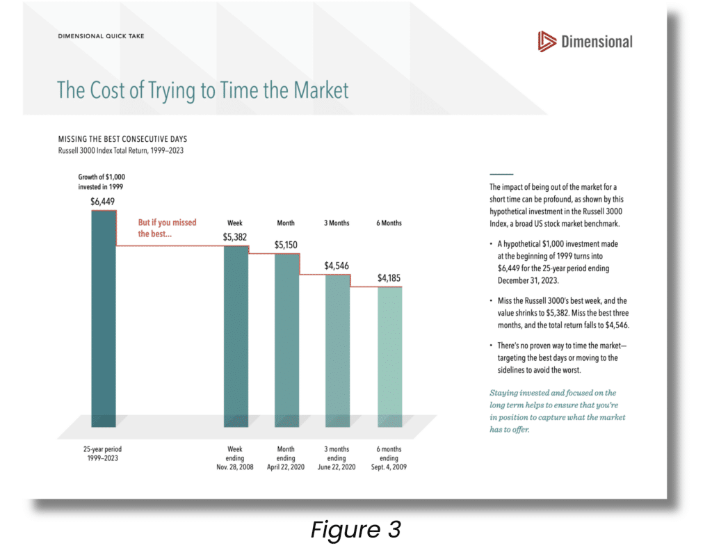 That is a trick question because rarely do investors get that answer right! The moral of the story? Best to keep your eye on the big picture and absolutely, positively not get sucked into notions of timing the market. The negative consequences of taking yourself out of the market even for a short period of time cannot be denied (See Figure 3). For example, a hypothetical investment of $1,000 made in 1999 turns into $6,449 for the 25-year period ending December 31, 2023. However, miss the Russell 3000’s best week, ending November 28, 2008, and the value shrinks to $5,382. Miss the three early pandemic months ending June 22, 2020, and the total return falls to $4,546. (Source: DFA – The Cost of Trying to Time the Market – 2/2024)